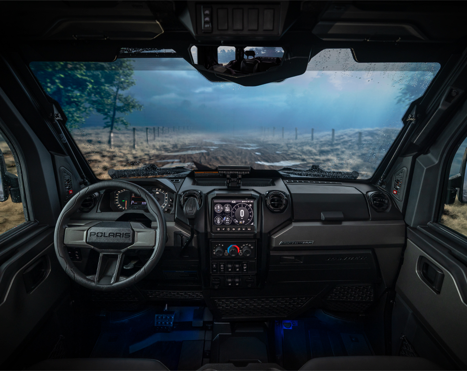 - Premium Pro-Shield Cab, Doors with Full Power Windows, Fixed Glass Windshield with Wiper, Rear Glass Panel, Dome Light, Door Puddle Lighting, Interior Accent Lighting, Rearview Mirror, Heat, AC, Defrost. Premium Contoured Seats with Additional Bolstering, Premium Headrests and Center Armrest. Premium, Telescoping Steering Wheel and Painted Interior Accents. Polaris Pulse Electrical System (6 position), Overhead Switch Panel, Roof Pulse Bar (6 position), 140 Amp Charging System, Front Bumper, DC Outlet, USB Charge Port, Trickle Charger, 12V Located in the Cargo Box with In-Dash On/Off Switch, NFC Front Badge, NorthStar Badge. Polaris HD 6,500 Lb. Synthetic Rope Winch with Autostop and Wireless Remote.